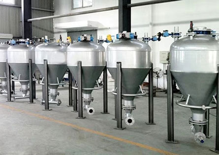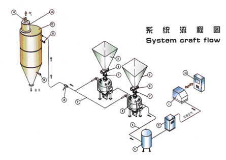 壓力發送灌輸送系統輸送過程:1、系統處于進料狀態,這時進料閥、排氣閥打開,進氣閥、出料閥關閉,物料在重力作用下落入泵倉內;2、當1個或多個泵倉內的料位計被覆蓋,或達到設定落料時間時,進料閥、排氣閥關閉;3、在進料閥、排氣閥關閉并且充氣密封結束后,進氣閥、出料閥打開,物料進入輸送管道開始輸送。4、在輸送過程中,應根據壓力調氣閥的開關狀態,以控制管道的輸送壓力,防止堵塞管道;5、當管道輸送壓力低至設定值時,進氣閥、出料閥關閉,經停一個停止延遲時間;6、循環重復,等待下一個循環開始;