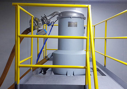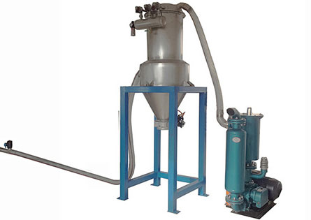 負壓稀相氣力輸送系統啟動時,存放容積內的物料經回轉鎖氣供料閥的定量供給,在管路內與羅茨真空泵產生的負壓氣流相混合后得到加速,固氣二相流在輸送管內用成較穩定的流態并被提升至遠處的一體式過濾分離器中,氣流與物料的混合體在進入到旋風分離器壁后被強制改變運行軌跡,由于固體物料的密度比氣體的密度大得多,因而產生了很高的高心力,使得物料在進入筒壁后失去了直線運動的速度,在重力作用下落入旋風分離器的錐體部,再通過錐體部的回轉鎖氣卸料閥因均勻給料至下游的生產設備,負壓稀相系統的動力源采用羅茨真空泵,氣體可以為過濾后的大氣或經過干燥凈化處理的氣體。